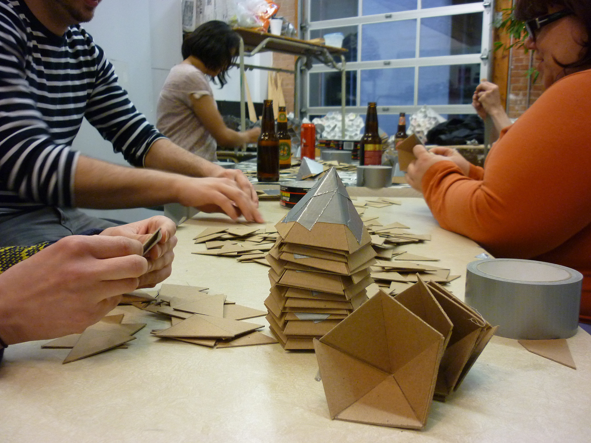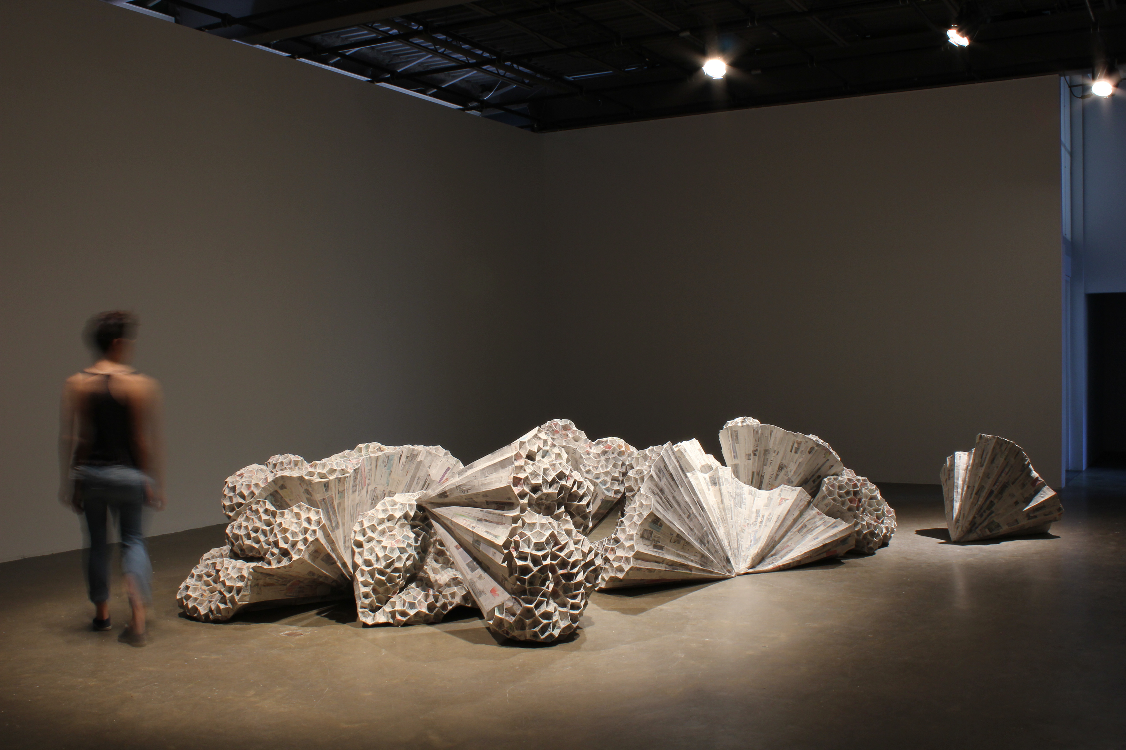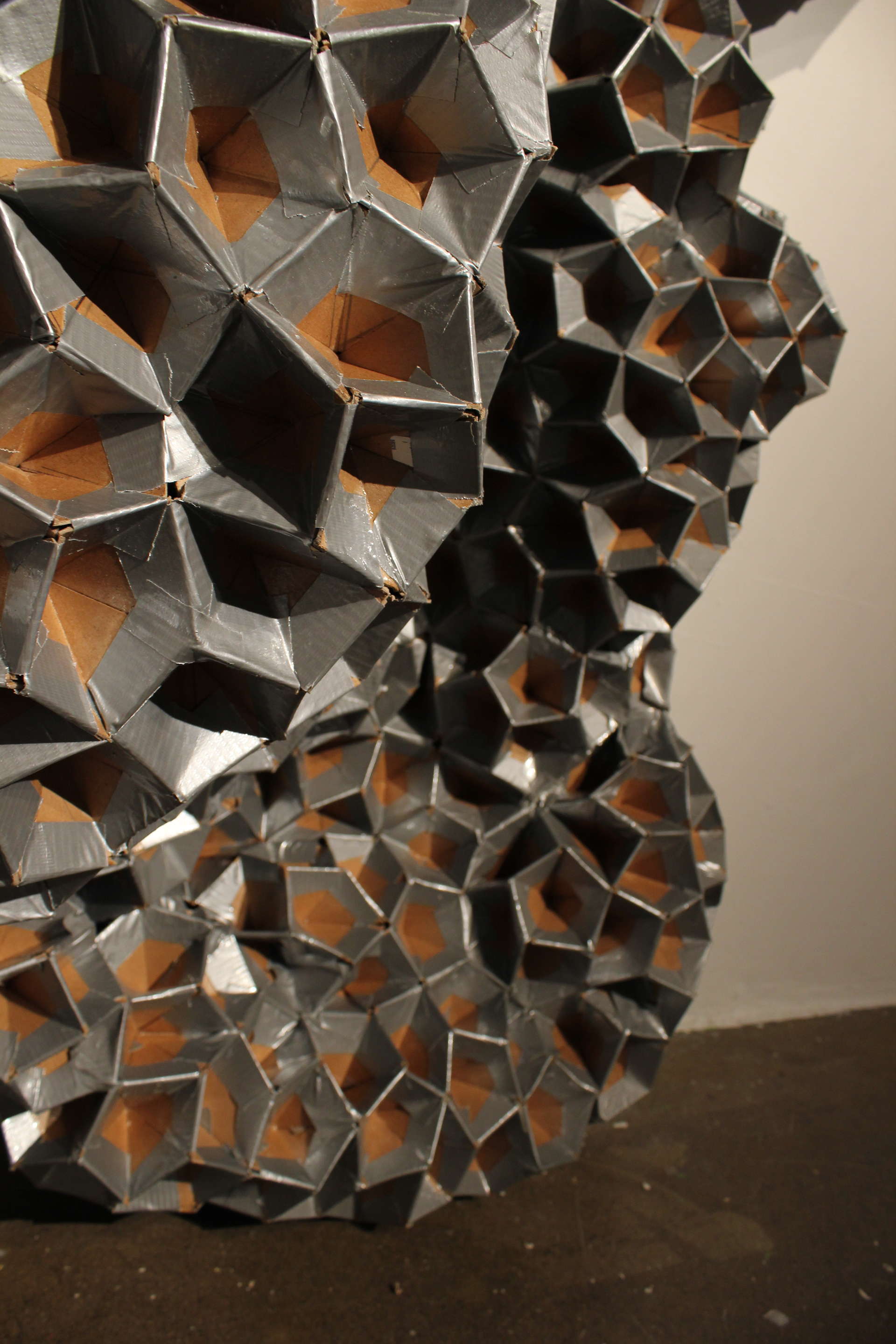 Recycled cardboard, duct tape, sculpted paper, wood.