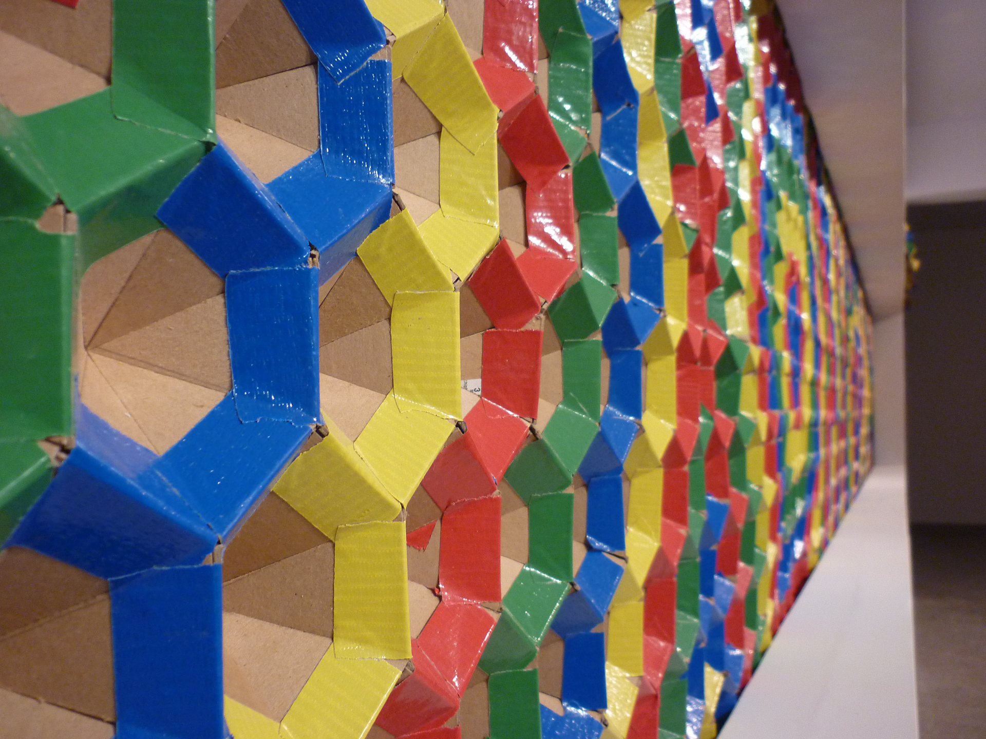 Coloured duct tape, recycled cardboard, wood, gypsum.